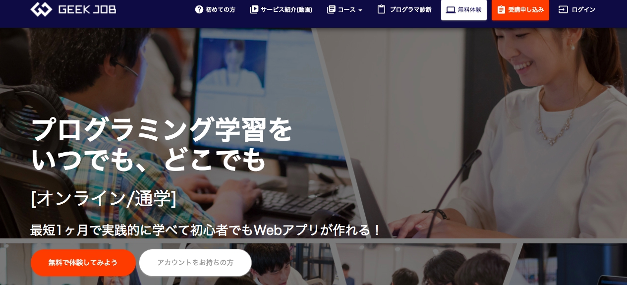 GEEK JOBは、自ら学び、自らサービスを創り出す人を増やすというミッションのもと、第二新卒/フリーターの方に向けた、無料のプログラミング学習&就職支援サービスです。