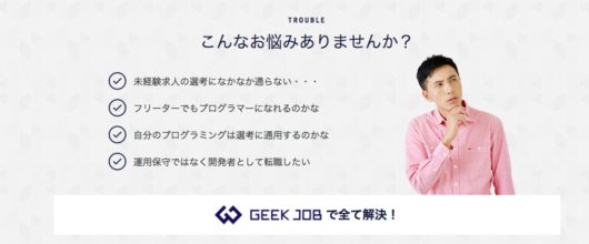 そのため、本気でプログラマーに転職したいのであれば、GEEK JOBキャンプのような、就職支援付きのプログラミングスクールを利用された方が良いとは思われます。