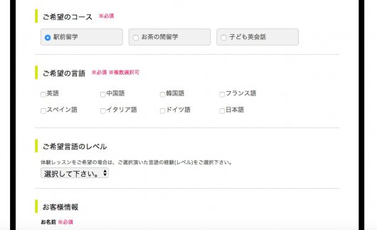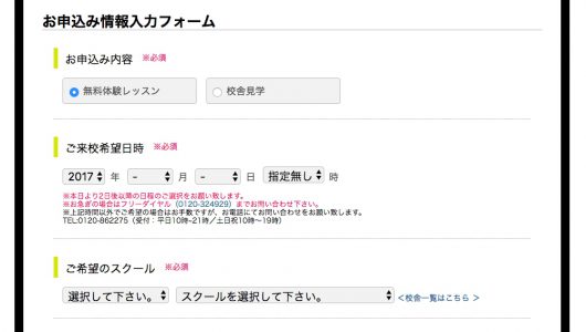 そうして、下記のフォームから「無料体験レッスン」を選択し、「ご来校希望日時」を選択肢、「ご希望のスクール(校舎)」を選択します。