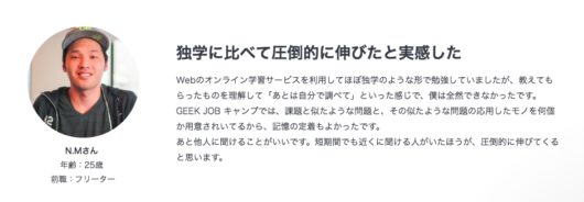 GEEKJOBキャンプの受講生の71.6%はパソコン初心者からスタートしているものの、転職に成功していますので、プログラミング未経験者にも向いています。
