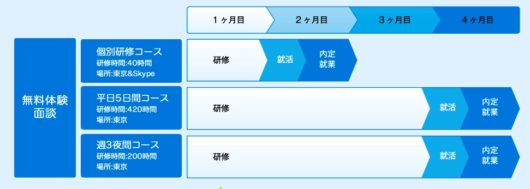 また、プログラマカレッジの研修期間は、短期集中1ヶ月のSkype個別研修コース、2ヶ月の通学での個別研修、3ヶ月の通学授業・実践形式コースの3種類があります。