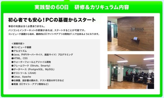 具体的には、コンピューター基礎からJava、PHP、HTML、CSS、Linux、Apacheなどなど、パソコンの初心者からでも最終的にECサイトやアプリ開発が一人でできるようになるレベルまで目指します。