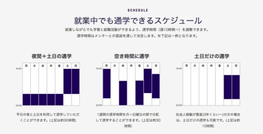 例えば、現在仕事をしている場合でも、夜間+土日であったり、土日だけの通学であったりと、フレキシブルなスケジュールでプログラミングを学ぶことが可能です。