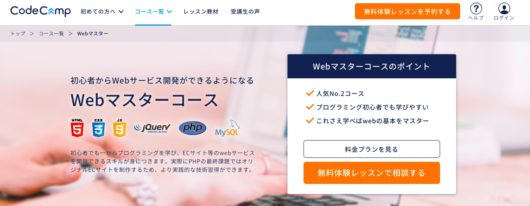 CodeCampは様々なプログラミングコースを提供していますが、Webマスターコースでは、HTML5/CSS3、Javascript/jQuery、PHP/MySQLを学ぶことができます。