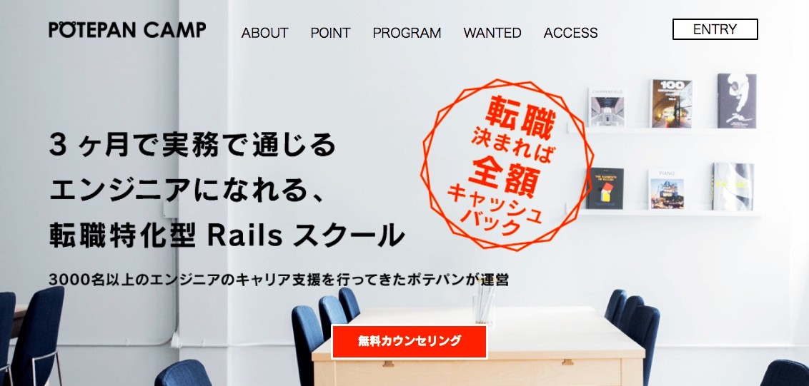 運営会社のポテパンはITキャリア専門の転職支援企業のため、ポテパンキャンプは、受講生にRuby on Railsを身につけてもらい、転職に成功してもらうことを目的としています。