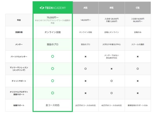 料金比較を確認すると、完全オンラインスタイルで、オンラインテキストを自習する形式でも構わないという方は、Tech Academyが安くなっています。