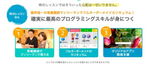 侍エンジニア塾は、日本初のマンツーマンレッスンを提供したプログラミングスクールです。