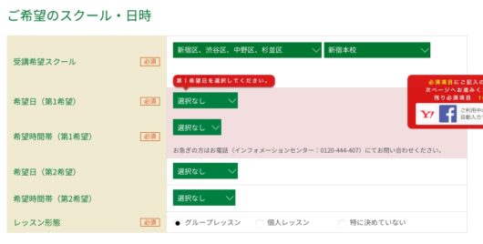 そうすると希望の日時を選択できるページへ移動しますので、希望日時やレッスン形態を入力します。