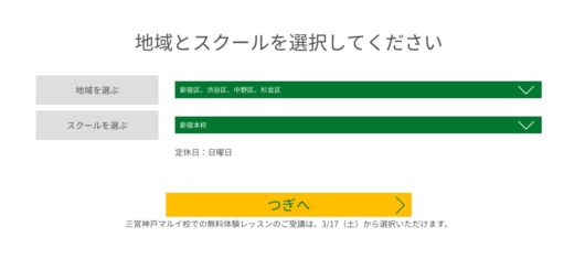 まずは、こちらの無料体験のページにとんで、地域とスクールを選択します。