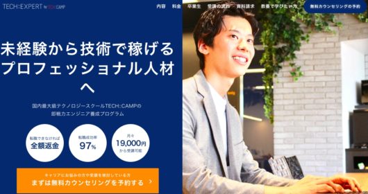 | テックキャンプも、テックエキスパート(TECH::EXPERT)という、20代向けのエンジニア養成プログラムを提供しています。