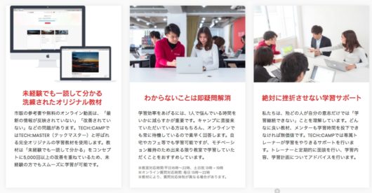 一都三県在住の20代の方であれば、完全無料のエンジニアカレッジやGEEKJOBキャンプを利用するのも一手ですが、テックキャンプも、テックエキスパート(TECH::EXPERT)という就職支援コース(就職できなければ全額返金保証)を提供しています。