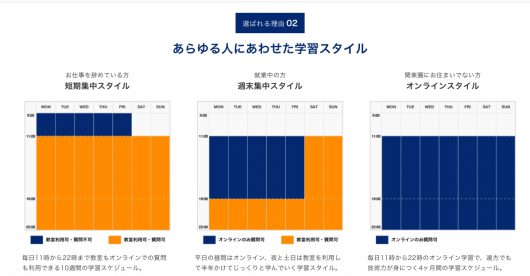 そんなテックキャンプエキスパートの特徴は、「短期集中スタイル」「週末集中スタイル」「オンラインスタイル」などの受講スタイルが選べるところです。