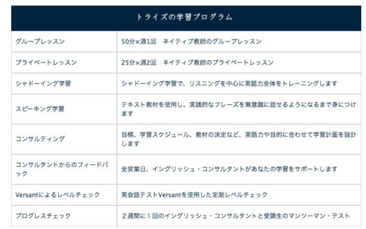 一方、トライズは1年間でみっちり英語を学習しましょうというプログラムですので、英会話スクールの月額費用で比較してみると、実は大手英会話スクールよりも安いのです。