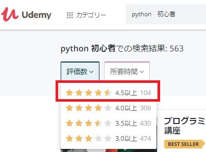 【評価数】と【所要時間】でフィルターをかけてみます。どうせなら4.5以上の評価を受けている講座を受けてみたい。