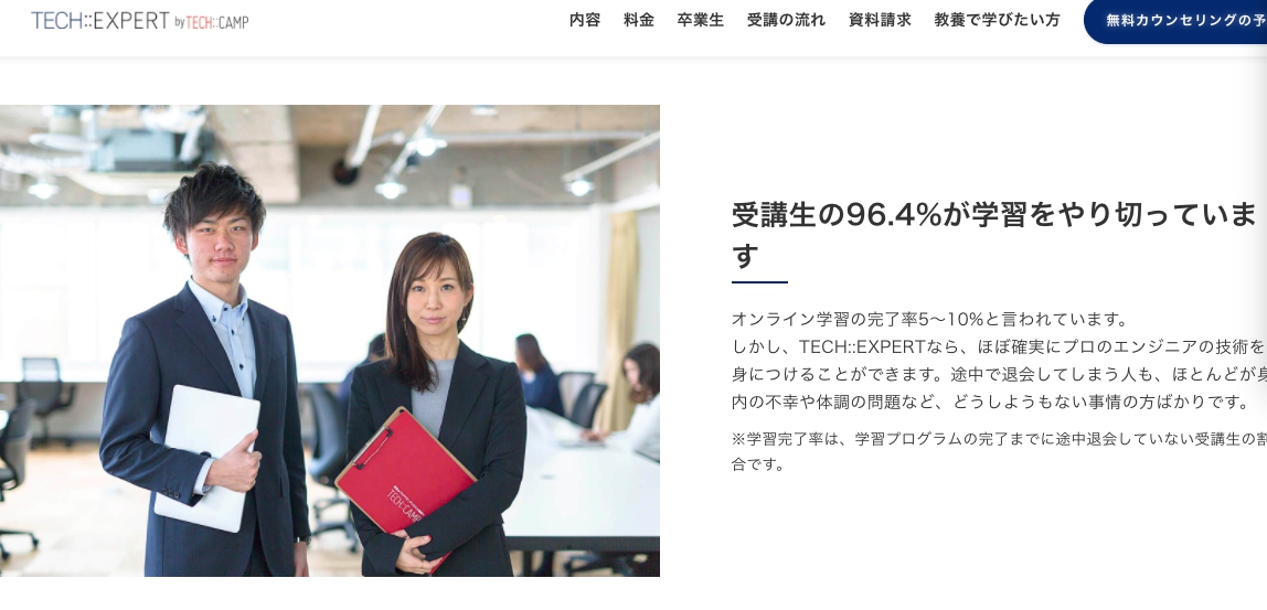 ですので、いざWebCampProに通うとなったら、今の仕事を辞めて通うような形になるかと思われますので、そのようなスタイルが嫌な方は、テックエキスパート(TECH::EXPERT)の方が適しています。
