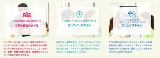 ・形式:少人数の教室へ通学・オンライン・MIXスタイル ・料金:273,000円〜他 ・内容:WEBデザイナースタンダードコース他 |
