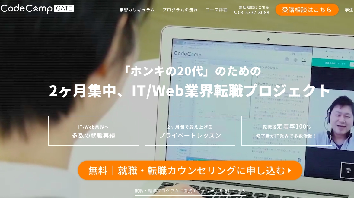 コードキャンプは300社を超える企業研修に導入されている、実績のあるプログラミングスクールですが、「CodeCampGATE」という、20代向けの転職支援サービスも提供しています。