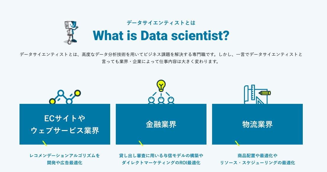 データサイエンティストとは、高度なデータ分析技術を用いて、ビジネス課題を解決する専門職ですが、一言でデータサイエンティストと言っても業界・企業によって仕事内容は大きく変わります。