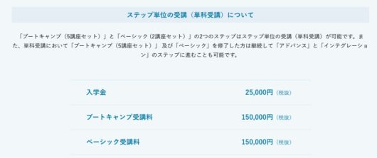 まず、単科受講の場合は、入学金25,000円(税抜)+ブートキャンプ受講料150,000円、入学金25,000円(税抜)+ベーシック受講料150,000円などの形で選択が可能です。
