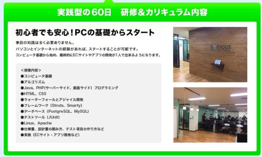 一方で、エンジニアカレッジ(プログラマカレッジ)の場合はコンピューターの基礎から、Java、PHP(サーバーサイド・画面サイド)、HTML、CSSなど、幅広く学びます。