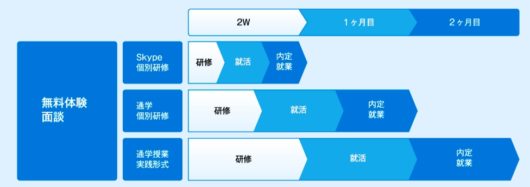 具体的には、無料体験面談後に、Skype個別研修、通学個別研修、通学授業実戦形式のどれかを選択する形となります。
