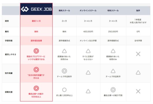 そのため、本気でプログラマーに転職したいのであれば、GEEK JOBキャンプのような、就職支援付きのプログラミングスクールを利用された方が良いとは思われます。