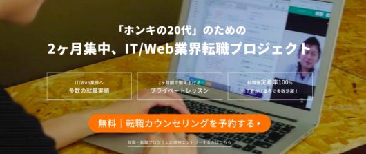 ・料金:198,000円(約2ヶ月) ・形式:オンラインのマンツーマン(自分で講師を選択) ・対象:30歳未満(社会人経験必須) ・備考:一定条件をクリアして就職に成功すれば全額返金あり ・詳細:CodeCampGATEの口コミへ |