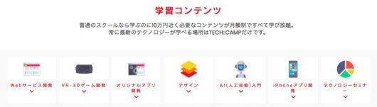テックキャンプは、Webサービス開発、VR・3D開発・オリジナルアプリ開発・デザイン・AI(人工知能)入門・iPhoneアプリ開発・テクノロジーセミナーなどの学習コンテンツを、全て学び放題な点が特徴です。
