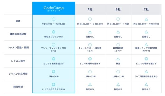 CodeCampは有料のプログラミングスクールにはなりますが、実際に他社プログラミングスクールよりも、料金は安くなっています。