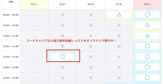 予約が空いていれば今日や明日にでも受講が可能ですので、まずは一度コードキャンプの無料体験レッスンを受講されてみてはいかがでしょうか?