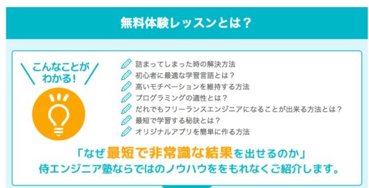 なお、侍エンジニア塾の無料体験レッスンでは、最短でプログラミングスキルを学べるノウハウなども教えてもらえます。