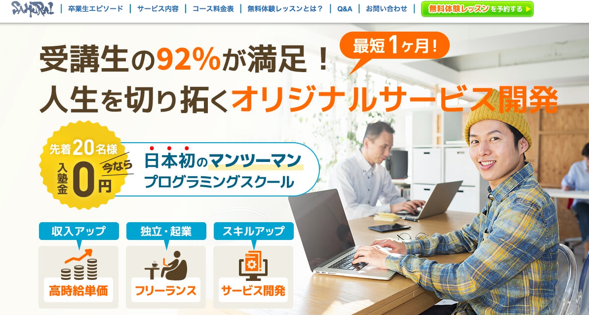 侍エンジニア塾は、日本初のマンツーマンレッスンを提供したプログラミングスクールです。