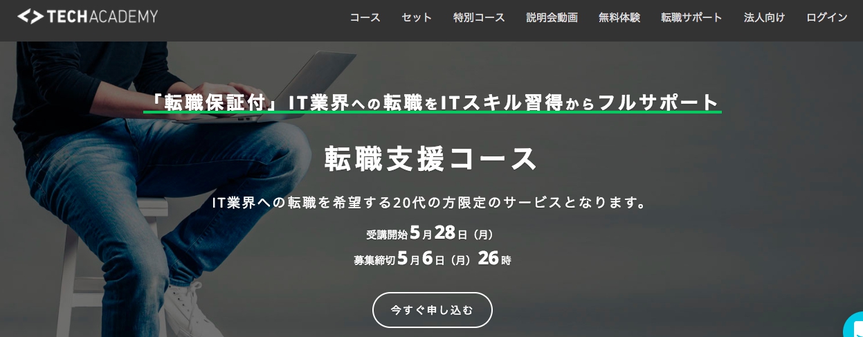 続いて、TechAcademyは、未経験からIT業界への転職を希望される方を対象に「転職保証付」の特別なオンラインブートキャンプの「転職支援コース」も提供しています。