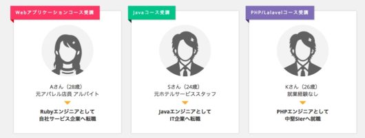 このような手厚いサポートもあってか、元アパレル店員のアルバイトの方がRubyエンジニアとして転職に成功したり、元ホテルサービススタッフがJavaエンジニアとしてIT企業への転職に成功したり、就業経験なしの方はPHPエンジニアとして転職に成功していたりします。