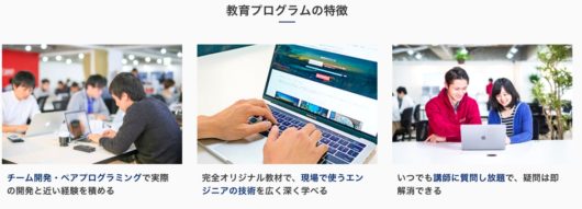 筆者が調べた限りでは、30歳以上の方や、東京近郊以外にお住いの方でも受講OKなのは「テックキャンプエキスパート」や、18才〜35才までは完全無料の「0円スクール」ぐらいですので、その点が特徴的です。
