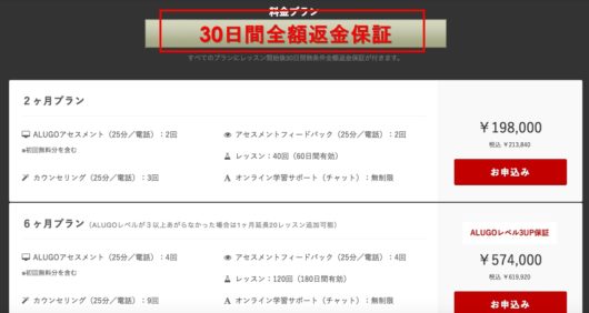 ただし、ALUGOには一般の大手英会話スクールにはない「30日間無条件全額返金保証」がついています。