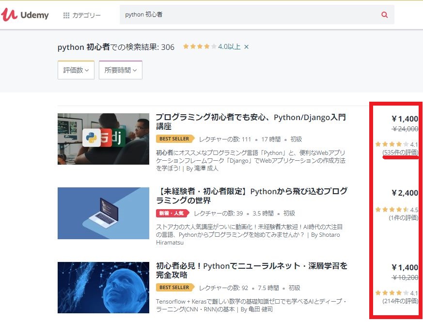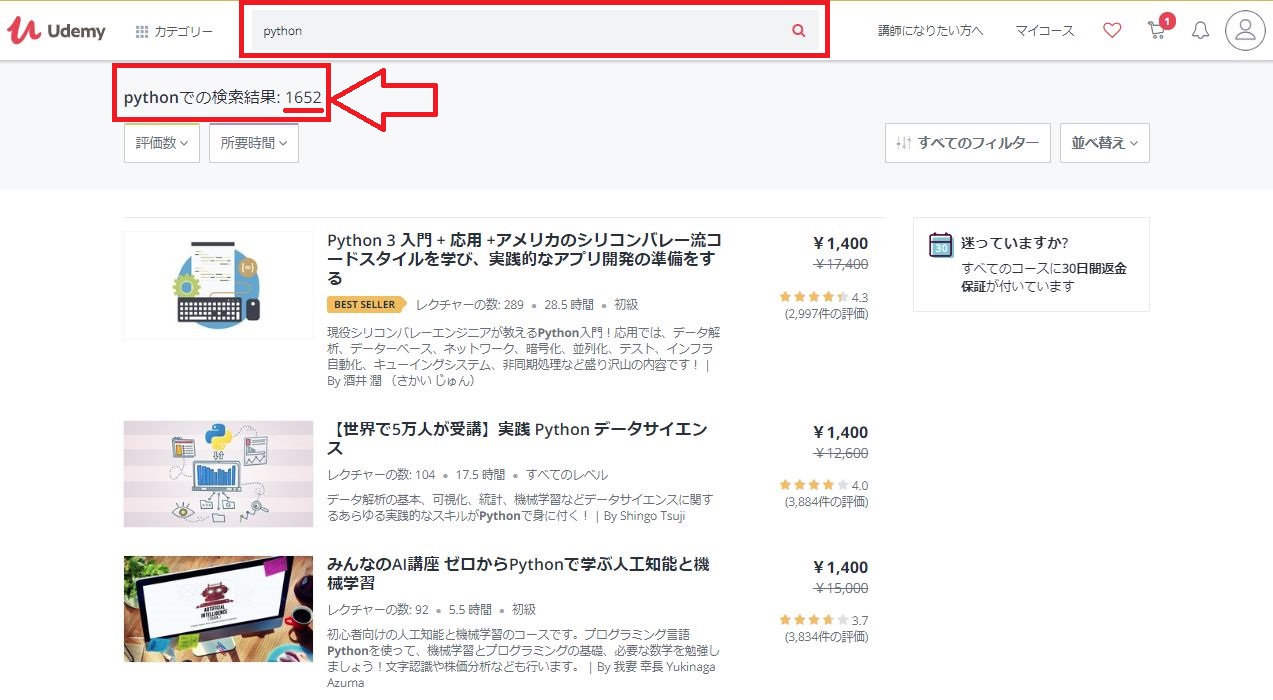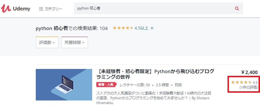 検索してみた結果、104件もあったはずですが…引っ掛かかったpython講座は1件だけ。