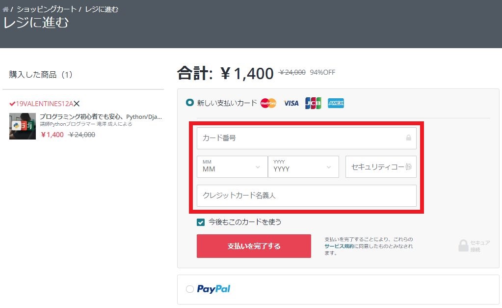あとはクレジットカード情報を入れて【支払いを完了する】をクリックすれば購入完了です。