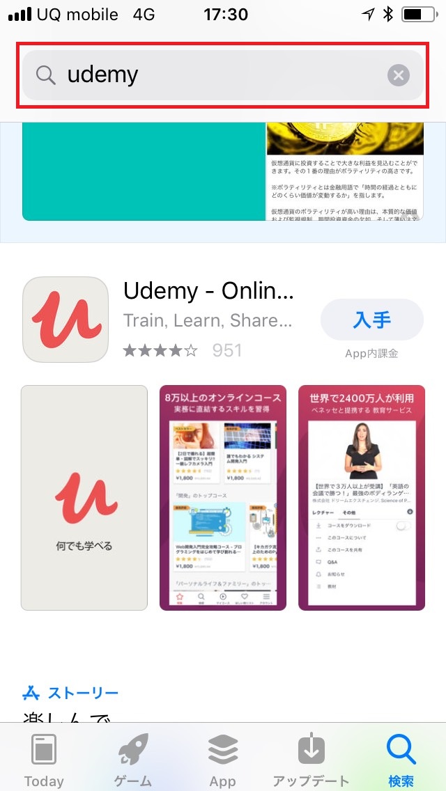 アップルストアーで「udemy」と検索し、ヒットしたら【入手】をタップしてスマホへダウンロードします。