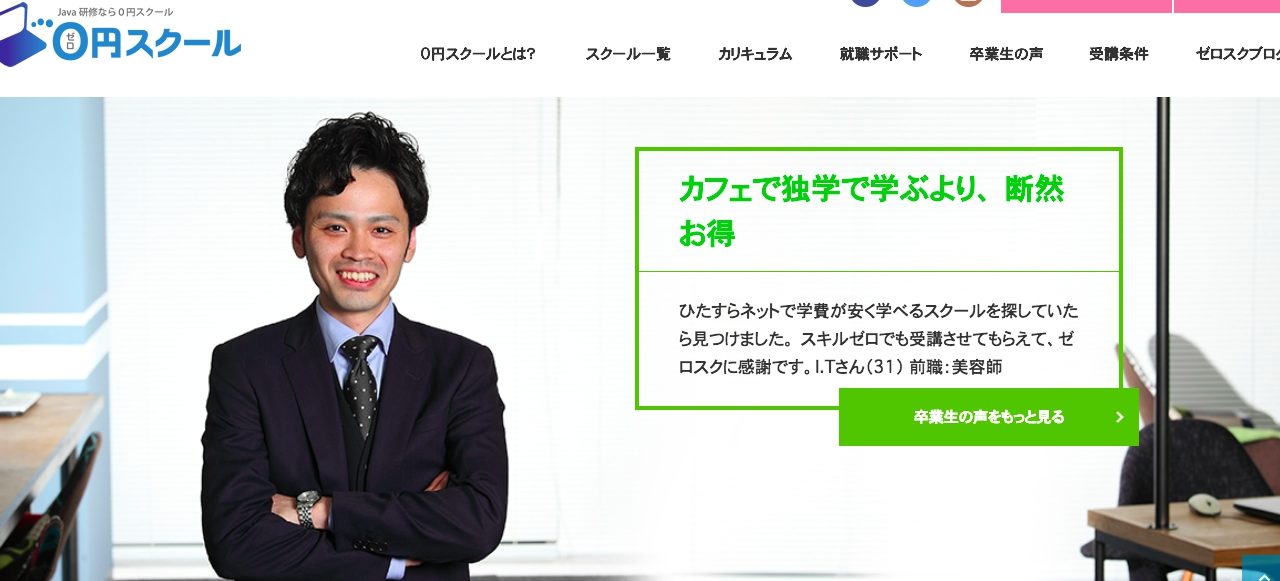 0円スクールは、プログラミングスクール の中では珍しく、30代以上でも正社員雇用前提で、無料でJAVAを学べるプログラミングスクールです。